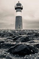 Deze vuurtoren werd gefotografeerd vanuit een laag perspectief aan de Nederlandse kust. De foto werd vervolgens omgezet in een zwart-witfoto.