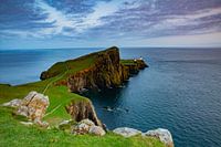 Bij Neist Point op de prachtige rots staat de zeer beroemde vuurtoren van Neist Point. Deze is hier later op de avond na zonsondergang in bedrijf.