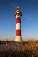 De prachtige rood-witte vuurtoren van Nieuwpoort aan de Belgische kust. Genomen op een warme zomeravond net voor zonsondergang. De oorspronkelijke vuurtoren werd gebouwd in 1881 maar werd meermaals vernietigd tijdens WOI en WOII. De huidige vuurtoren dateert van 1949.