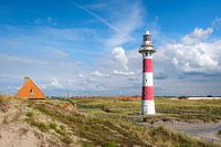De vuurtoren van Nieuwpoort (België), getrokken vanuit de duinen met het militair domain van Lombardsijde op de achtergrond.