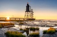 Vuurtoren Obereversand aan de Waddenzee van de Wurstense Noordzeekust bij zonsondergang.