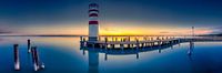 De vuurtoren staat op een mooie steiger en ziet er bijzonder sfeervol uit bij zonsondergang. Panoramafoto 310200ays