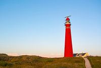 De vuurtoren (Noorderdtoren) van het Waddeneiland Schiermonnikoog tijdens een kleurrijke zonsondergang. De vuurtoren staat in de duinen aan de Noordzee kant van het eiland.