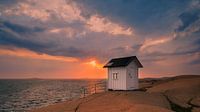 Zonsondergang bij de kleine vuurtoren van Stangehuvud. De vuurtoren is het bijzondere herkenningspunt van het gebied, zowel zichtbaar vanaf het land als vanaf de zee. Het werd gebouwd in 1890 en was in gebruik tot 1940. In dat jaar werd in het kleine houten huisje eindelijk het licht gedoofd.