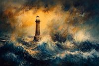 Een eenzame vuurtoren rijst majestueus op uit de woeste golven, terwijl de lucht oplicht in dramatische tinten geel en zwart. De woeste golven omarmen de basis van de toren, terwijl een warm licht van hoop door de stormachtige duisternis schijnt. De krachten van de natuur en het menselijk vernuft vormen hier samen een krachtig symbool…