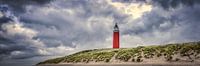 Een panorama van de vuurtoren Eierland beter bekend als de vuurtoren van Texel met mooie donkere wolken. Een beeld in de winter van de mooie vuurtoren in het duinlandschap.