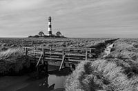 Koop de foto Vuurtoren Westerheversand met bruggetje in de kwelders - zwart-wit van Frank Herrmann op canvas, aluminium dibond, (ingelijste) fotoprint, behang en ArtFrame, op maat geprint in Fine-Art kwaliteit.