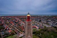 Drone shot van vuurtoren ' T hoge licht in Zeeuws Westkapelle, Nederland. Door het inzetten van een drone tijdens deze opname kon ik een uniek en ander beeld maken van deze mooie vuurtoren dan ik vanaf de grond zou kunnen doen. Een krachtig beeld van de vuurtoren, het licht dat over het dorp waakt en de scheepvaart veilig voorbij de kustlijn loodst. Deze opname is gemaakt voordat het avond werd en het licht van de vuurtoren net ontstak.