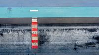 Terwijl ik langs het water liep, zag ik de geschilderde en verroeste zijkant van een boot. De kleuren en de linieaal voor de waterstanden deden me denken aan een landschap aan zee met een vuurtoren. Dit is prachtig als abstract werk in je interieur als muurdecoratie.