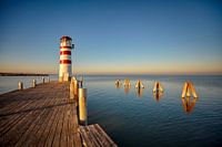 Ochtendzon op de vuurtoren bij Podersdorf aan het Neusiedl-meer (Oostenrijk, Burgenland)