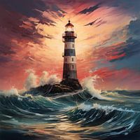 Koop dit schilderij Vuurtoren bij een storm zonsondergang olieverf van TheXclusive Art als reproductie op canvas, aluminium dibond, (ingelijste) fotoprint, behang en ArtFrame, op maat geprint in Fine-Art kwaliteit.