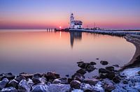 Vuurtoren bij zonsopkomst in Holland. De rode zon komt langzaam op achter de vuurtoren "Het Paard van Marken". Prachtige paarse, blauwe, en oranje kleuren verlichten de wolkeloze lucht. De weerspiegeling van de vuurtoren in het water, en de bevroren rotsen met een dun laagje ijs op de voorgrond vormen samen een prachtig…