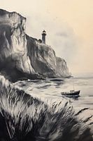 Een fascinerend spel van licht en schaduw ontvouwt zich in deze monochrome scène, waar een eenzame boot zachtjes wiegt op het water, omringd door majestueuze kliffen en de waakzame blik van een vuurtoren. Deze harmonieuze compositie is perfect voor de woonkamer om een sfeer van rust en ontspanning te creëren.