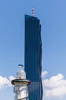 Oude vuurtoren op het Donau-eiland en de DC Towers wolkenkrabber in de wijk Donau City in Wenen, Oostenrijk.