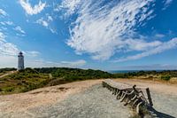 Bankje gebogen door de wind op het observatiedek bij de vuurtoren aan de Hiddensee, Rügen, Mecklenburg Vorpommern, Oostzee