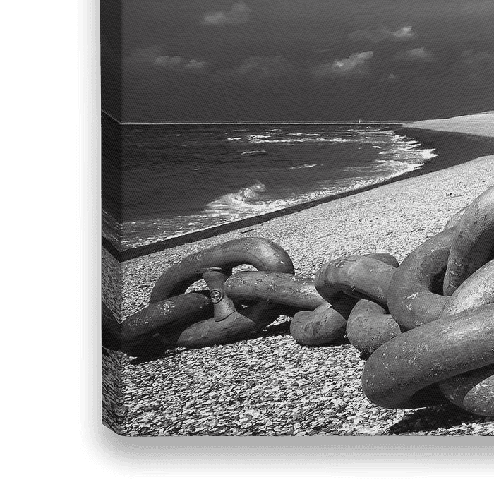 Op de voorgrond ligt een zware scheepsketting. Dit detail vormt een krachtig symbool voor de verbondenheid tussen mens en zee. De ketting lijkt het verleden te verankeren aan het heden – een tastbare herinnering aan de maritieme geschiedenis van Den Helder, waar staal, wind en water samenkomen.