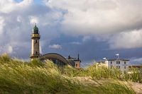 Vuurtoren en theepot tijdens de storm in Warnemünde, Mecklenburg-Vorpommern, Duitsland.