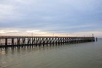Vuurtoren aan het eind van de Pier van Blankenberge tijdens de zonsondergang.