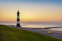 Gele Fiat 500 aan de vuurtoren als de zon net onder is gegaan.