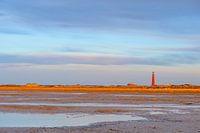 Vuurtoren in de duinen op het eiland Schiermonnikoog tijdens de zonsondergang in het Waddenzeegebied tijdens de zonsondergang in het noorden van Nederland.