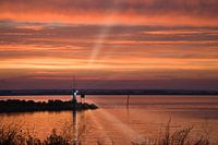 Vuurtoren in de haven bij zonsondergang. Romantische avondsfeer, met brandende lucht in rood en oranje. Genomen in Scandinavië, Zweden.
