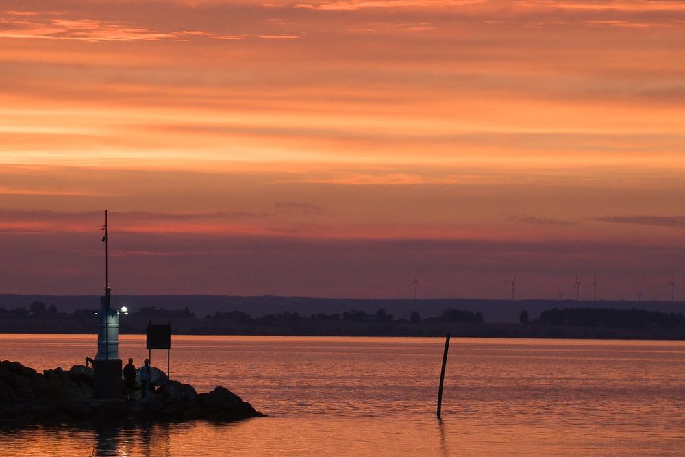 Vuurtoren in de haven bij zonsondergang. Romantische avondsfeer, met brandende lucht in rood en oranje. Genomen in Scandinavië, Zweden.