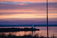 Vuurtoren in de haven bij zonsondergang. Romantische avondsfeer, met brandende lucht in rood en oranje. Genomen in Scandinavië, Zweden.