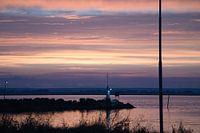 Vuurtoren in de haven bij zonsondergang. Romantische avondsfeer, met brandende lucht in rood en oranje. Genomen in Scandinavië, Zweden.
