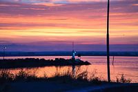 Vuurtoren in de haven bij zonsondergang. Romantische avondsfeer, met brandende lucht in rood en oranje. Genomen in Scandinavië, Zweden.
