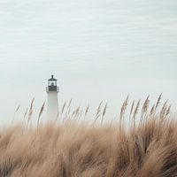 Een eenzame vuurtoren rijst op in de zachte, grijze mist en waakt als een stille schildwacht over de uitgestrekte zee. Omringd door zachte, gouden grassen die dansen in de wind, straalt hij rust en standvastigheid uit. Het mysterieuze samenspel tussen natuur en mens geeft tegelijkertijd een gevoel van melancholie en hoop.
