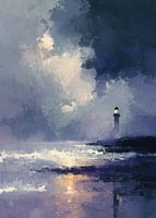 Een impressionistisch olieverfschilderij toont het silhouet van een oude vuurtoren die zijn licht richt op stormachtige wolken en reflecteert op kalm zeewater. Zachte penseelstreken, een minimalistische stijl en het harmonieuze kleurenpalet van paars en blauw creëren een dramatische maar kalme sfeer. Details in hoge resolutie, vloeiende texturen en een contrastrijke compositie voegen diepte, helderheid en hyperrealisme toe aan het werk. Perfect voor liefhebbers van maritieme taferelen, stijlvolle woonkamers of high-end wanddecoratie - een elegant, sfeervol kunstwerk vol impressionisme en moderne verfijning.