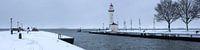 Een hoge resolutie opname van de oude vestingshaven en de vuurtoren van Hellevoetsluis in de winter met een vers pak sneeuw.
