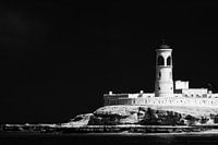 Haven van Sur in Oman in zwartwit. Door het contrast tussen het witte gebouw en de zwarte lucht ontstaat een welhaast surrealistisch effect