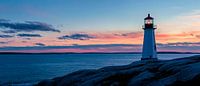 Een glanzende vuurtoren staat majestueus aan de kust terwijl zachte golven de rotsen ronden. Een magische zonsondergang verlicht de lucht in zachte roze en blauwe tinten en creëert zo een rustgevende sfeer. Dit kunstwerk is perfect voor de woonkamer om een uitnodigende en ontspannen sfeer te creëren.