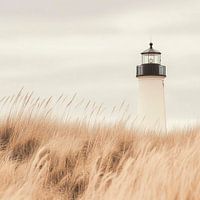 Een majestueuze vuurtoren licht op uit glooiende zandduinen, omringd door golvend, goudkleurig gras dat danst in de wind. De lucht is zachtgrijs, terwijl de vuurtoren met zijn opvallende zwarte koepel trots de kust bewaakt en zeevaarderslicht werpt in de duisternis. Een beeld van vrede en kracht in de natuur.