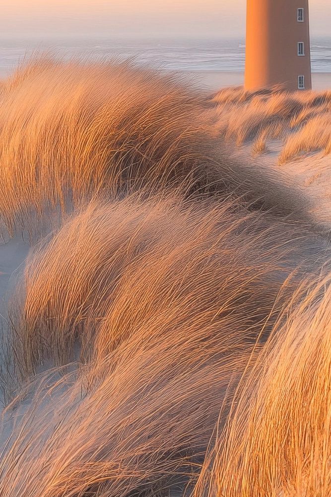 Zachte zandgolven en gouden grassen omlijsten de charmante vuurtoren, die trots in de verte staart. De warme kleuren van de zonsopgang baden het tafereel in een kalmerend licht, terwijl het geluid van de zee een harmonieuze melodie speelt. Een plek van rust waar hemel en aarde elkaar kussen.