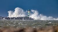 De vuurtoren op de pier van IJmuiden in een najaarsstorm de zee beuk op de pier. Het water komt hoog tegen de vuurtoren aan.
