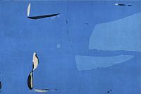 Lighthouse No. 18: Een ruimtelijk experiment in puur blauw. Door lagen van verschillende blauwtinten creëert dit werk een diep gevoel van diepte op een vlak oppervlak. Minimalistische accenten van zwart en wit werken als de adem van de oceaan en brengen een rustige, moderne, o "Quiet Luxury" ische esthetiek in elke leefruimte.