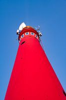 Vuurtoren Schiermonnikoog Noordertoren naar boven gezien met een strakblauwe lucht op de achtergrond tijdens zonsondergang op het waddeneiland tijdens een mooie winterdag.