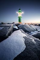 Vuurtoren van de Warnemünde West Pier bij nacht