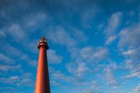 De rode vuurtoren van Andenes tegen een half bewolkte blauwe lucht. De toren staat op het eiland Andøya van de Vesterålen en Lofoten in het noorden van Noorwegen.