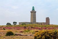 Prachtige opname van de vuurtoren bij Cap Frehel, aan de smaragdkust van Bretagne, Frankrijk, met bloeiende paarse struikhei (Calluna vulgaris) en gele gaspeldoorn (Ulex europaeus) in de zomer