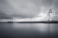 Zwart/wit-opname van de vuurtoren van Hellevoetsluis, Zuid-Holland, op een stormachtige dag.