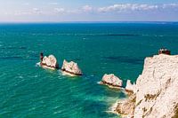 The Needles en de Needles Lighthouse, een vuurtoren op de top van de wereldberoemde krijtrotsen in het westen van het Isle of Wight in Engeland, Groot-Brittannië