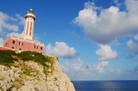 Een adembenemende natuurlijke plek in Anacapri, met de vuurtoren op een klif die zich bevindt bij Punta Carena, een van de mooiste plekken op het eiland Capri, Italië. Een prachtige lucht en de blauwe oceaan.