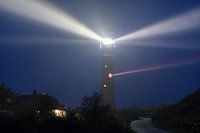 Vuurtoren en vissershuisjes in de nacht op het eiland Schiermonnikoog in Nederland tijdens een mistige nacht. Een pad leidt door de duinen naar een vuurtoren.