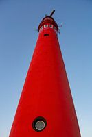De rode vuurtoren van Schiermonnikoog van onderaf gezien.