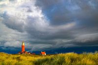 Vuurtoren op het waddeneiland Texel in de duinen tijdens een stormachtige herfstochtend met een dramatische lucht erboven. De vuurtoren van Eierland staat op de noordpunt van het eiland.