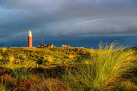 Vuurtoren op het Waddeneiland Texel in de duinen tijdens een stormachtige herfstochtend. De vuurtoren van Eierland staat op de noordpunt van het eiland. Focus op het duingras op de voorgrond.
