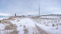 Het duinlandschap in de winter met sneeuw op het waddeneiland Texel, met natuurlijk de vuurtoren van Texel. Ook wel genoemd vuurtoren Eierland. De vuurtoren bevind zich bij plaats De Cocksdorp.